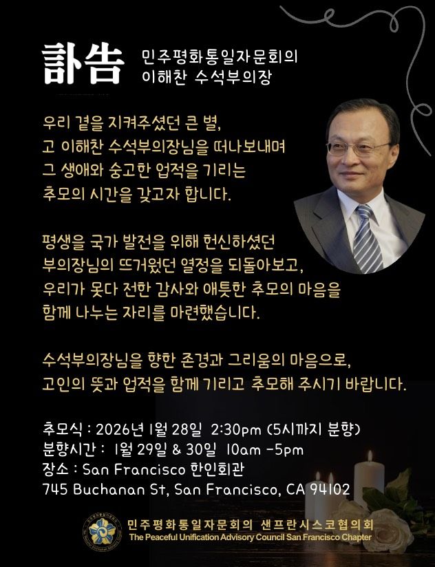 분향소는 1월 28일(수)부터 1월 30일(금)까지 샌프란시스코 한인회관에 설치·운영되며, 한인 동포 누구나 자유롭게 방문해 고인을 추모하고 조의를 표할 수 있도록 개방된다.