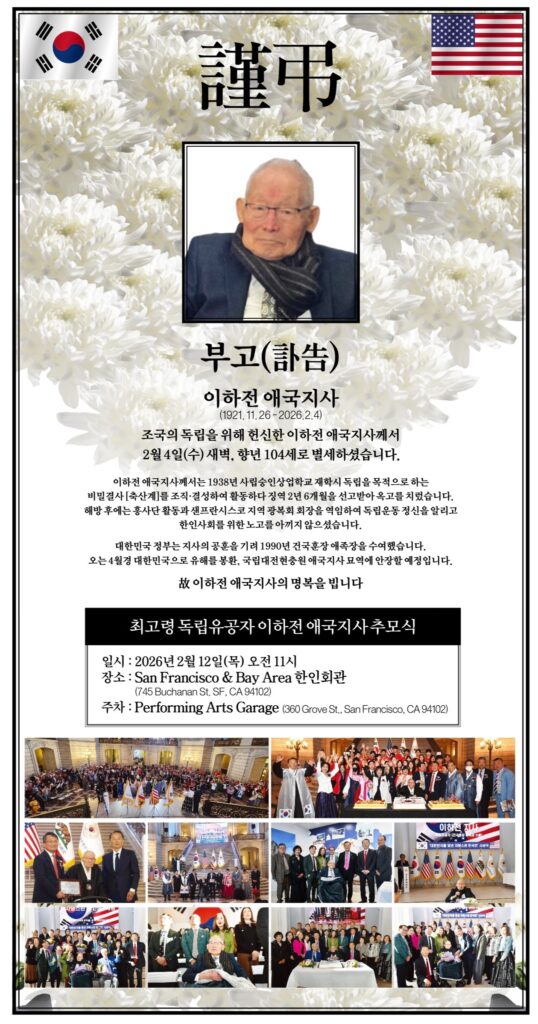 이제 조국 독립과 민족의 존엄을 위해 온 삶을 바치신 이하전 지사의 마지막 가시는 길을, 한인 사회가 함께 모여 경건한 마음으로 배웅하고자 합니다. 세대를 넘어 많은 한인 여러분께서 참석하시어, 그 뜻과 정신을 함께 기억해 주시기를 간곡히 부탁드립니다.