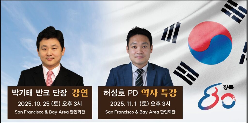 먼저 샌프란시스코 및 북가주 지역 한인 커뮤니티 발전을 위해 다양한 소식과 정보를 알려주시는 각 언론사 관계자님들께 깊은 감사를 드립니다. SAN FRANCISCO & BAY AREA 한인회(회장 김한일)는 광복 80주년을 기념하여 대한민국의 정체성과 독립운동 정신을 재조명하는 특별 강연 시리즈를 마련했습니다. 이번 강연은 대한민국 사이버외교사절단 반크(VANK)의 박기태 단장과 가장 많은 노벨상 수상자가 출연한 프로그램인 EBS 다큐멘터리 「위대한 수업, […]